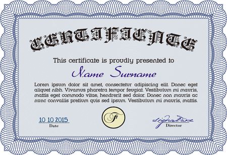 Blue Diploma template. With background. Excellent design. Border, frame.