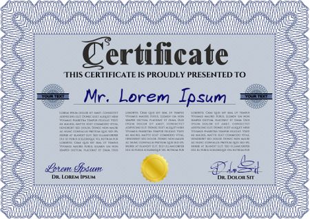 Blue Sample Diploma. With linear background. Modern design. Frame certificate template Vector.