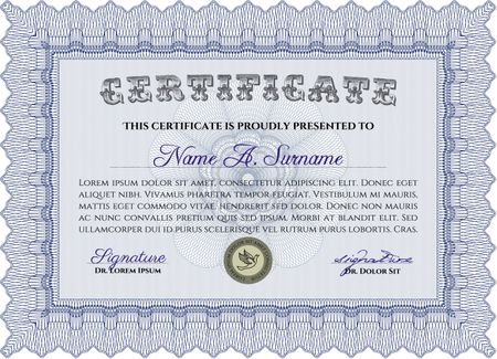 Certificate of achievement. With guilloche pattern and background. Diploma of completion. Sophisticated design. Blue color.