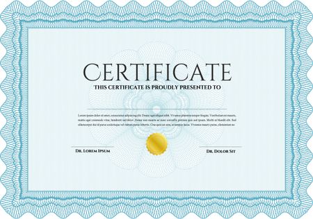 Certificate of achievement. With guilloche pattern and background. Sophisticated design. Diploma of completion. Light blue color.