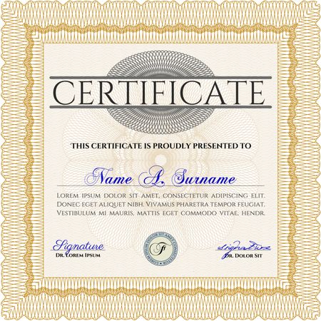 Certificate of achievement. Sophisticated design. Diploma of completion. With guilloche pattern and background. Orange color.