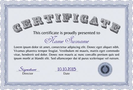 Certificate of achievement. Sophisticated design. Diploma of completion. With guilloche pattern and background. Blue color.