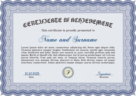 Certificate of achievement. Sophisticated design. With guilloche pattern and background. Diploma of completion. Blue color.
