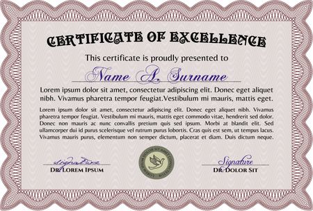 Certificate of achievement template. Diploma of completion. With guilloche pattern and background. Money design. Red color.