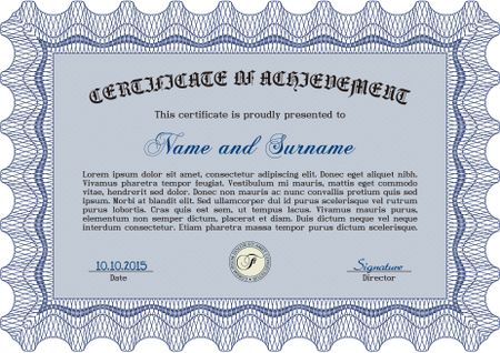 Certificate of achievement template. Sophisticated design. With guilloche pattern. Detailed.