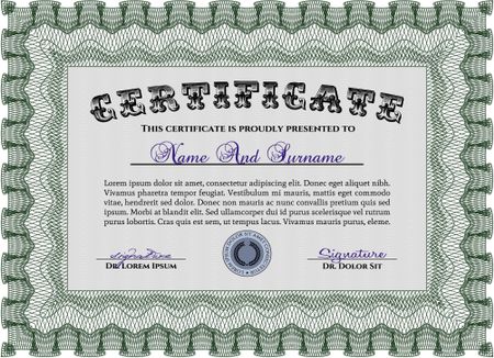 Certificate of achievement template. Sophisticated design. With guilloche pattern and background. Diploma of completion. Green color.