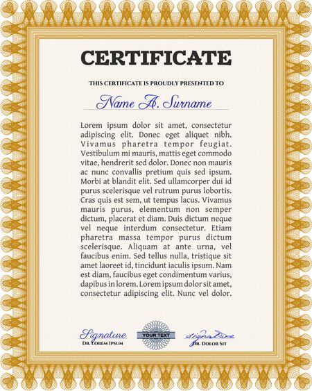 Certificate. Complex design. Printer friendly. Detailed. Orange color.