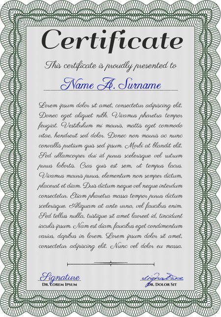 Certificate. Detailed. Complex design. Printer friendly. Green color.