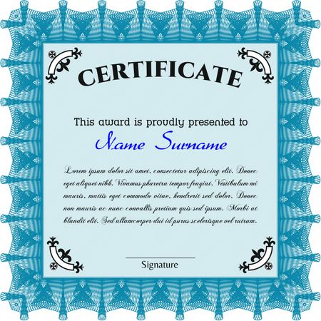 Certificate. Detailed. Printer friendly. Complex design. Light blue color.