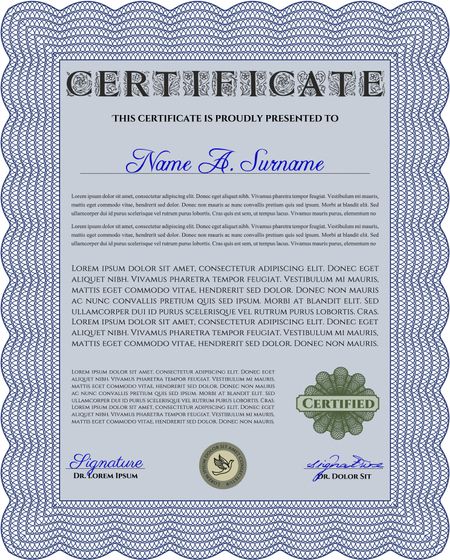 Certificate or diploma template. Customizable, Easy to edit and change colors. Cordial design. Easy to print. Blue color.
