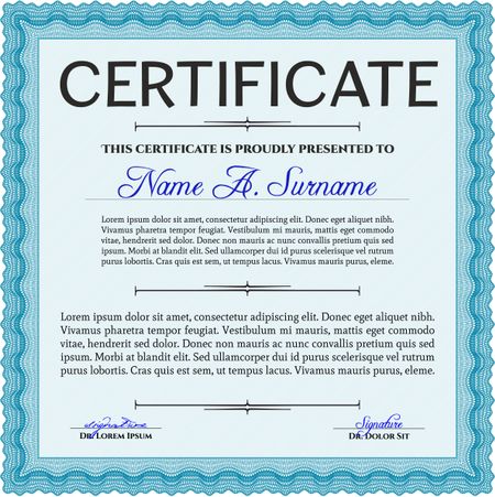Certificate or diploma template. Customizable, Easy to edit and change colors. Easy to print. Cordial design. Light blue color.