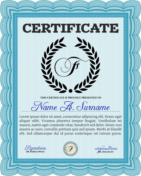 Certificate or diploma template. Good design. With background. Border, frame. Light blue color.