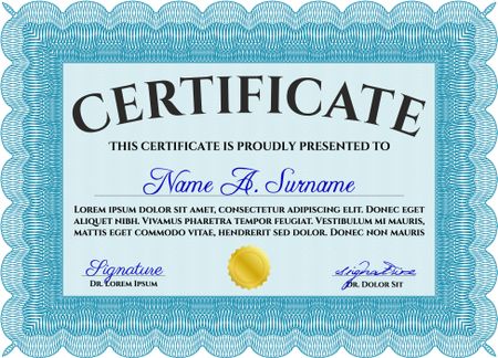 Certificate template. Customizable, Easy to edit and change colors. Nice design. Easy to print. Light blue color.