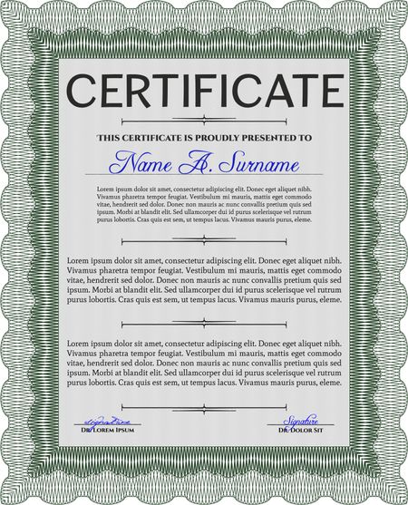 Certificate template. Nice design. Printer friendly. Detailed. Green color.