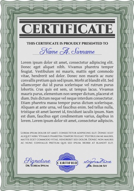 Certificate template. Printer friendly. Detailed. Nice design. Green color.