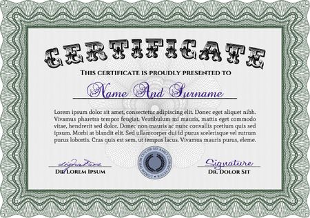 Certificatem diplmoa or award template. Design template. Money style design. With guilloche pattern. Green color.