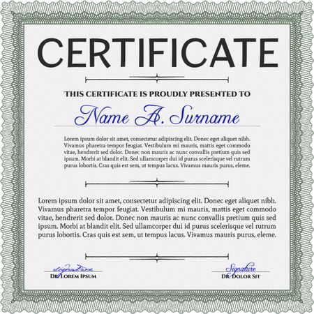 Certificatem diplmoa or award template. Design template. Money style design. With guilloche pattern. Green color.