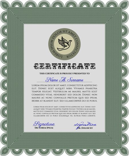 Classic Certificate template. Money Pattern. Award. With great quality guilloche pattern. Green color.