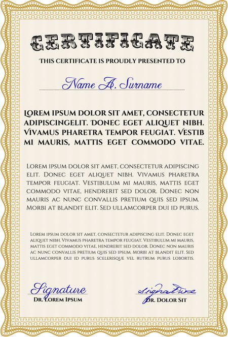 Classic Certificate template. Money Pattern design. With great quality guilloche pattern. Award. Orange color.