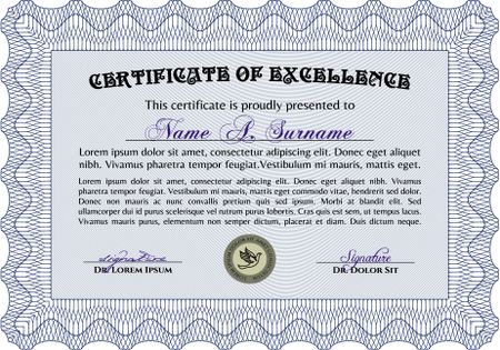 Diploma or certificate template. With complex background. Lovely design. Vector illustration. Blue color.