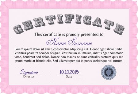 Diploma or certificate template. With complex background. Lovely design. Vector illustration. Pink color.