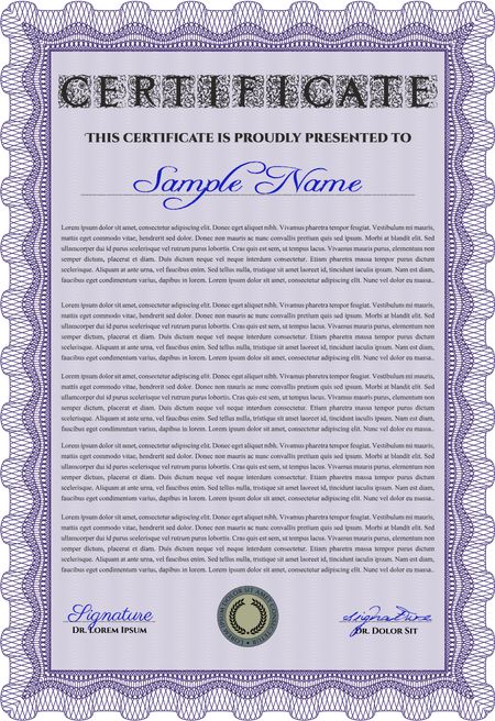 Diploma or certificate template. Complex background. Superior design. Vector pattern that is used in currency and diplomas.Violet color.
