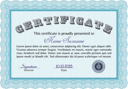 Diploma template. Excellent design. With background. Border, frame. Light blue color.