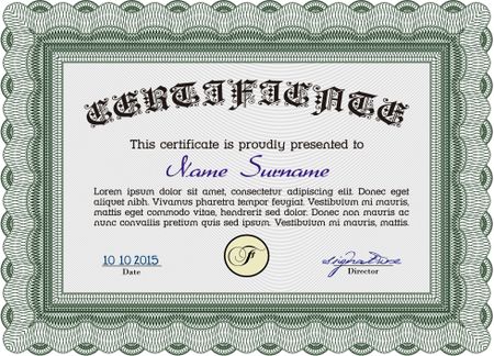 Green Diploma or certificate template. Vector illustration. With complex background. Lovely design.