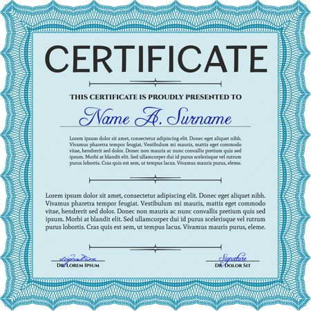 Light blue Certificate template. Nice design. Detailed. Printer friendly.