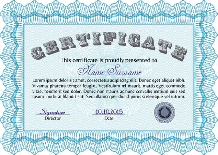Light blue Diploma template or certificate template. Beauty design. Vector pattern that is used in money and certificate. With quality background.
