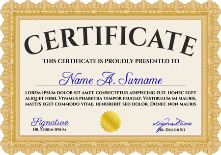 Orange Certificate of achievement template. Money design. With guilloche pattern and background. Diploma of completion.