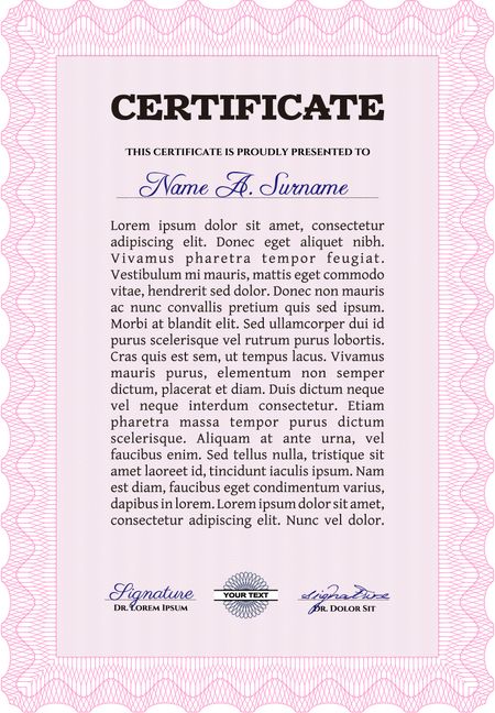 Pink Certificate or diploma template. Easy to print. Customizable, Easy to edit and change colors. Cordial design.