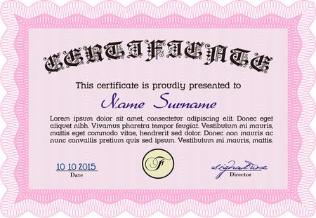 Pink Certificate template or diploma template. Complex background. Beauty design. Vector pattern that is used in currency and diplomas.