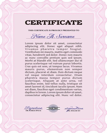 Pink Diploma template. With complex background. Vector illustration. Excellent design.