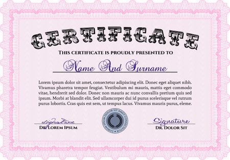 Pink Diploma template. With complex background. Vector illustration. Lovely design.