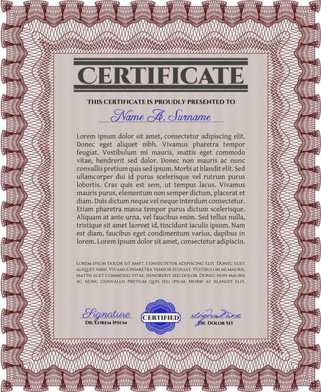 Red Sample Diploma. With linear background. Frame certificate template Vector. Modern design.