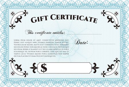 Retro Gift Certificate template. Border, frame.Beauty design. With guilloche pattern and background.