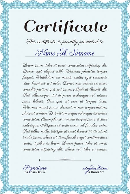 Sample certificate or diploma. With complex background. Border, frame.Cordial design.