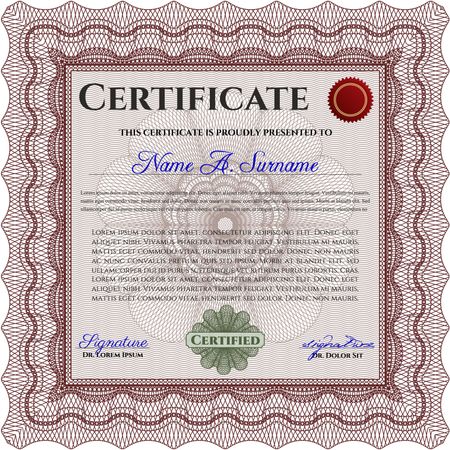 Sample certificate or diploma. With complex linear background. Retro design. Vector certificate template. Red color.