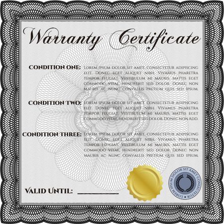 Sample Warranty certificate template. Vector illustration. Excellent complex design. With guilloche pattern and background.