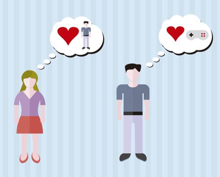 Vector illustration or man and woman (boy and girl), girl loves him, boy loves video games