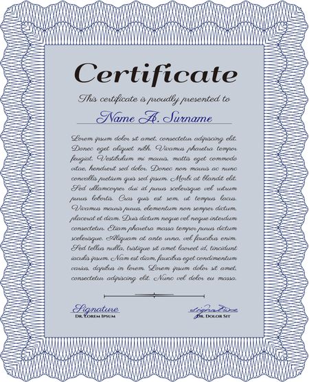 Vertical certificate or diploma template. Blue color, with background and sample text.