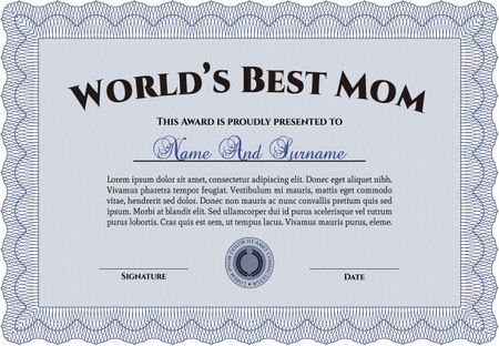World's Best Mom Award. With guilloche pattern and background. Vector illustration.Good design.