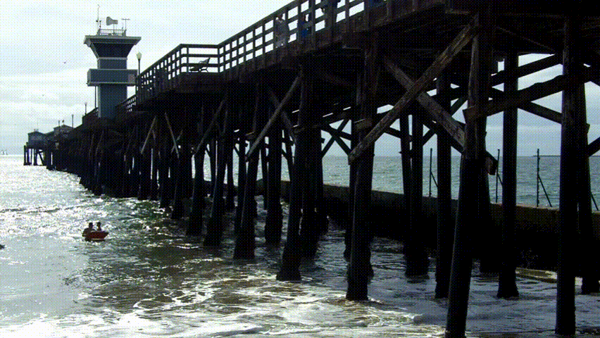 Boys seen from a distance in silhouette play and swim in the Pacific Ocean surf under the historic wooden pier in Seal Beach, CA.