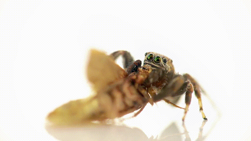 Closeup of jumping spider feeding on living clothes moth