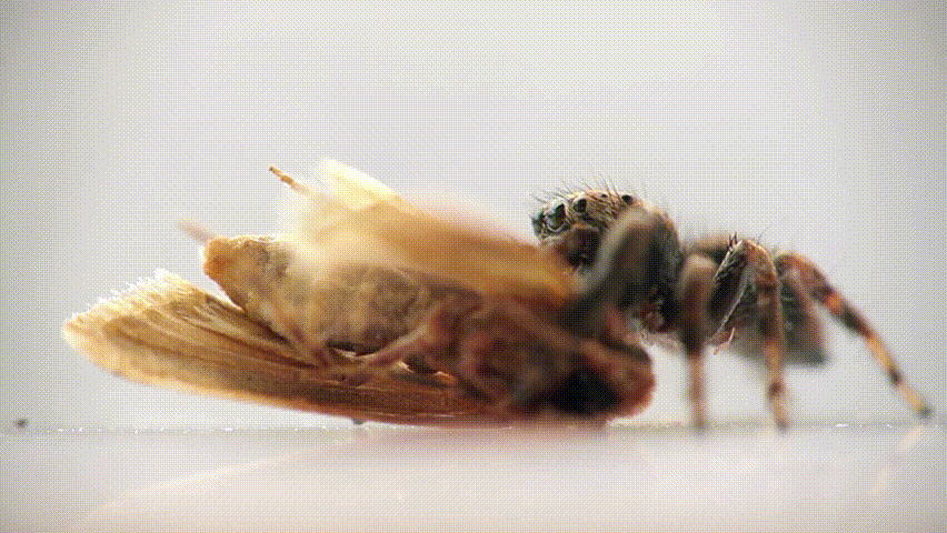 Closeup of jumping spider feeding on living clothes moth