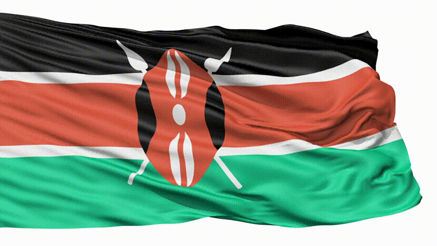 Flying Flag Of Kenya with a Maasai shield and spears symbolising defense of the country.