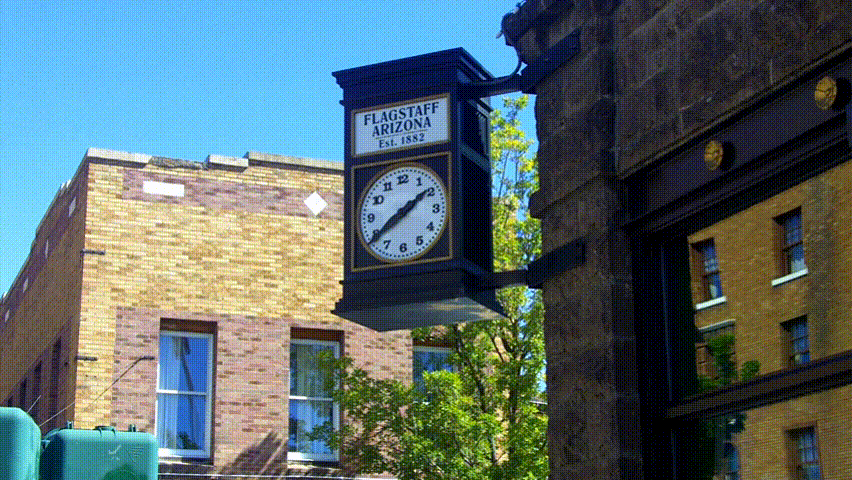 An historic clock tells the time in historic Downtown Flagstaff, Arizona.