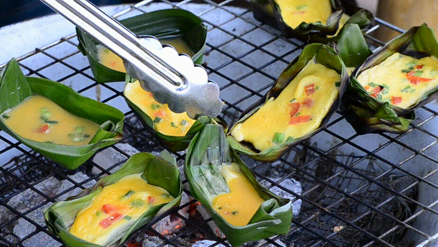 "Kai-Pam" Famous Omelet Of Northern Thailand (egg in banana leaf roast on fire stove)"Kai-Pam" Famous Omelet Of Northern Thailand (egg in banana leaf roast on fire stove)