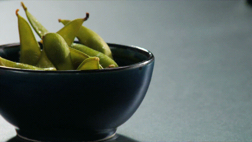 Lock down shot of salt being sprinkled on hot Edamame (soy beans).